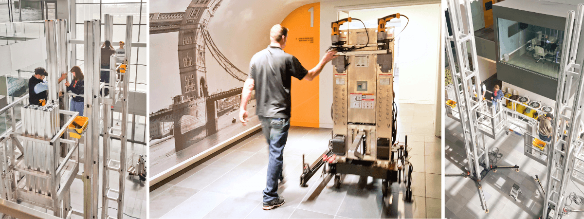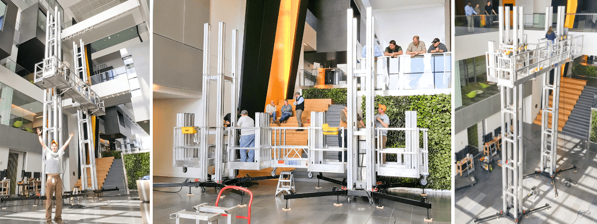 ReechCraft’s PowerMast freestanding quad-mast system can be set up in under two hours and can be moved to different areas while assembled. Other access methods had to be left in one place or completely disassembled and set up again to move. None of the alternatives met the time or height requirements needed to access the atriums. Finally, PowerMast components are extremely portable, so workers were able to transport the system with ease using elevators and stairs.