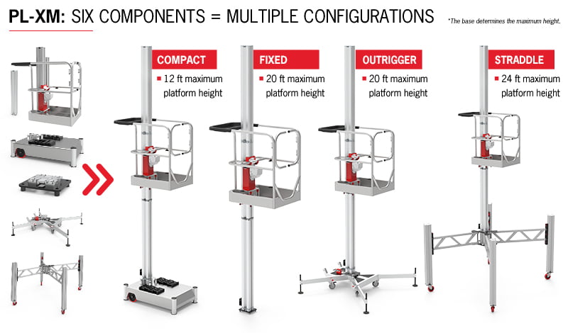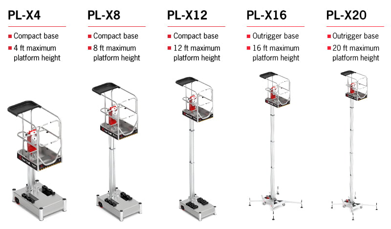 For customers who know exactly what they need, the PL-X series comes in five pre-packaged models: PL-X4, PL-X8, PL-X12, PL-X16, and PL-X20. The numbers in the model names represent the maximum platform height available on that model, and each model comes with a corresponding base that cannot be changed out. For example, the PL-X12 can reach a maximum platform height of 12 feet and comes with our new compact base option.