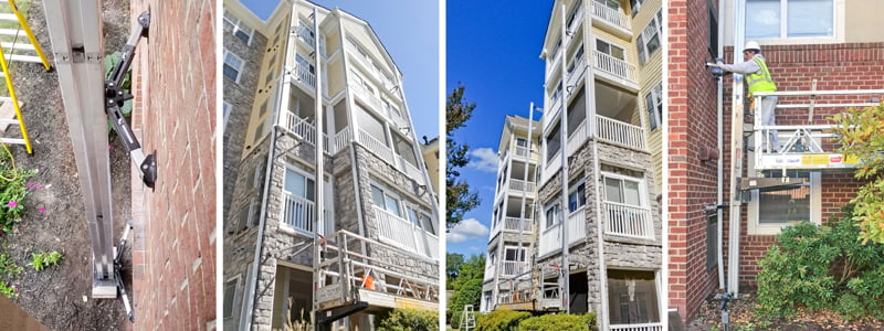 East Coast Rigging had a customer tasked with repairing two 10-year-old multi-family complexes in Herndon, VA. Moisture had become a problem within the exterior walls of the buildings. To repair the damage caused by the moisture, they needed to install new interior insulation, a vapor barrier, and new siding. The crew had numerous obstacles to work around including pools, courtyards, pitched roofs and power lines. A swing stage was not cost-effective due to the lower height of the building. Additionally, a boom lift was not a great option due to high rental rates and site access limitations.