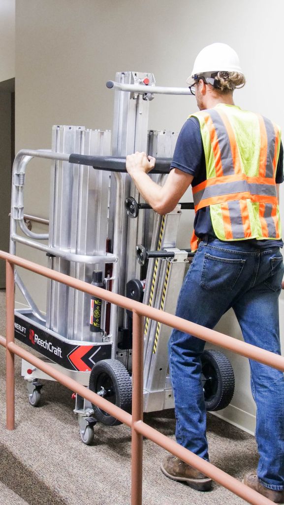The base features four swiveling and lockable casters that allow the PowerLift to easily rotate 360 degrees to make any job accessible.