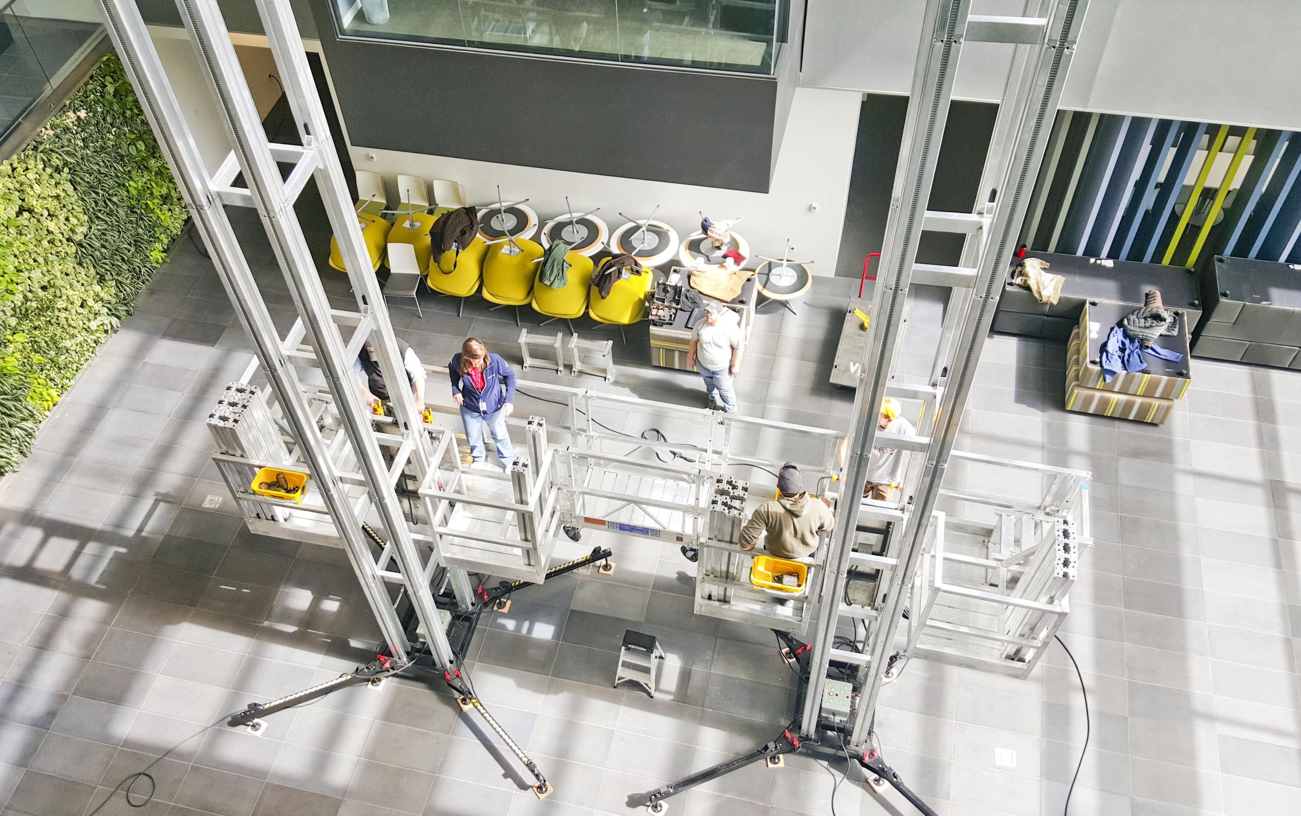 Because we utilize less costly and easily replaceable drill motors for power, each climbing unit must be operated independently. However, since there are generally at least two workers on a twin system who can operate both ends at the same time, synchronization is rarely an issue.